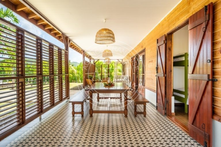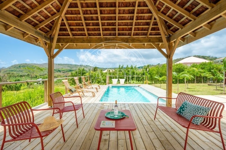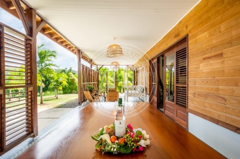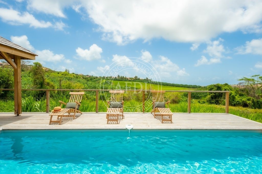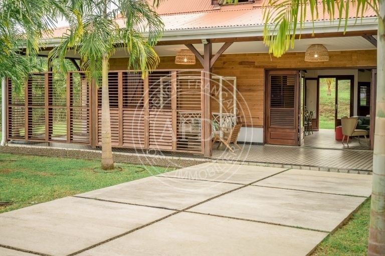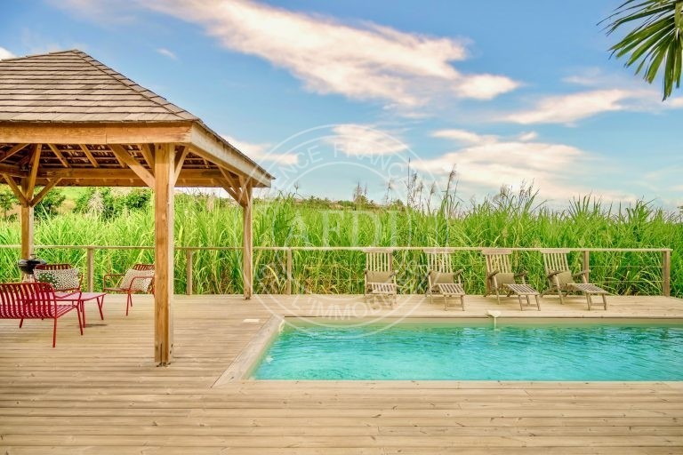 Nichée dans le secteur recherché de Belle-Air à Le Vauclin, cette propriété récente (2021) déploie tout son potentiel sur un magnifique terrain paysager de 4 350 m², offrant espace, intimité et qualité de vie dans un environnement résidentiel prisé. Dès l’entrée, la villa principale séduit par ses volumes et sa fluidité. Le séjour de 50 m², avec cuisine ouverte, constitue un véritable cœur de vie, baigné d’une lumière naturelle généreuse. L’ensemble s’ouvre sur une vaste véranda de 64 m², pensée comme une pièce supplémentaire à part entière, prolongeant harmonieusement l’espace intérieur vers l’extérieur. Le deck accueille une élégante piscine de 21 m² ainsi qu’un kiosque couvert de 18 m², créant un cadre idéal pour recevoir ou profiter pleinement du climat tropical. Le rez-de-chaussée propose trois chambres confortables, chacune accompagnée de sa salle d’eau, garantissant indépendance et confort à tous les occupants. À l’étage, une quatrième chambre avec salle d’eau complète l’ensemble, offrant un espace supplémentaire pouvant convenir à une suite parentale ou à un espace plus privatif. La propriété comprend également une dépendance de type F2, parfaitement autonome, bénéficiant de sa propre terrasse et de sa piscine privative. Cet espace indépendant peut être exploité en location saisonnière ou longue durée, accueiller des proches ou encore constituer un espace professionnel. La configuration du terrain permet une exploitation distincte des deux unités tout en préservant l’intimité de chacune. Construite sur soubassement béton avec élévation en pans de bois et charpente bois, la villa conjugue solidité et esthétique chaleureuse. L’intérieur, de qualité haut de gamme, est en excellent état d’entretien. Les volumes sont bien agencés, la vue est ouverte, et l’ensemble respire la cohérence architecturale. Avec une surface habitable pondérée d’environ 244 m², cinq chambres, cinq salles d’eau et deux piscines indépendantes, cette propriété représente une opportunité rare sur le marché du sud atlantique : idéale en résidence principale haut de gamme, pertinente pour un investissement locatif à fort rendement, ou parfaite pour un projet de vie mêlant habitation et revenus complémentaires. Un bien à la fois élégant, stratégique et patrimonial, prêt à accueillir un projet ambitieux.